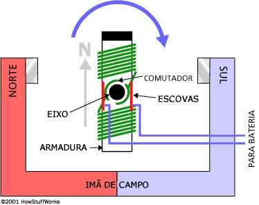 No esquema acima, você pode ver dois Ãmãs no motor: a armadura (ou rotor) é um eletroÃmã, ao passo que o Ãmã de campo é um Ãmã permanente (o Ãmã de campo também pode ser um  eletroÃmã, mas na maioria dos motores pequenos isso não acontece, para economizar energia).