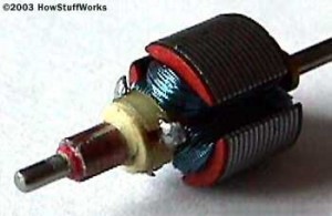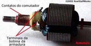 O eixo sustenta a armadura e o comutador. A armadura é um conjunto de eletroÃmãs (neste caso, três). A armadura neste motor é um conjunto de finas placas de metal unidas, com fios de cobre enrolados em volta de cada um dos três pólos da armadura. As duas pontas de cada fio (um fio para cada pólo) são soldadas em um terminal e então cada um dos três terminais é ligado a uma das placas do comutador. As figuras abaixo facilitam a visão da armadura dos terminais e do comutador: