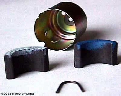 A peça final de qualquer motor elétrico CC é o Ãmã de campo. O Ãmã de campo neste motor é formado pela própria carcaça, mais os dois Ãmãs permanentes curvos: